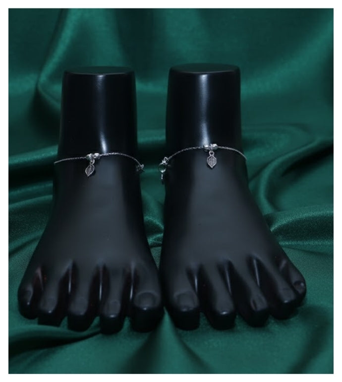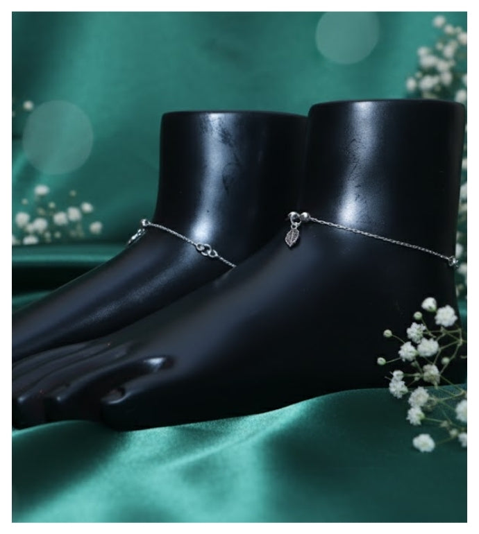 Inspired by nature ’s gentle beauty, the Leaf Whisper 92.5 Silver Charm Anklet by Swareva Jewels captures the essence of grace in motion. Crafted from pure 92.5 sterling silver, this elegant anklet features a dainty leaf charm delicately suspended from a sleek silver chain —a