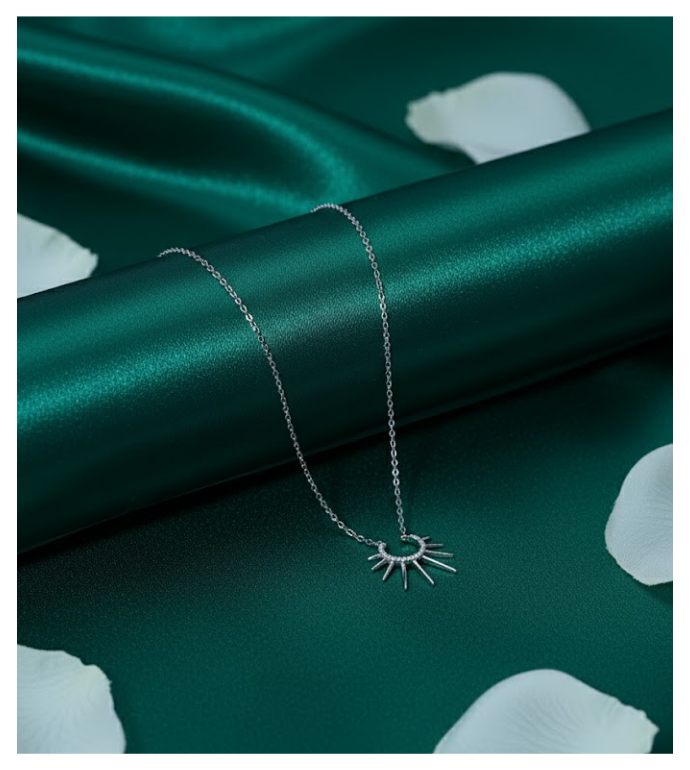 Crafted in 92.5 sterling silver, this necklace features a striking half-sun pendant with sleek silver rays radiating from a circle of fine cubic zirconia stones. Its modern yet symbolic design captures the essence of new beginnings and effortless elegance.